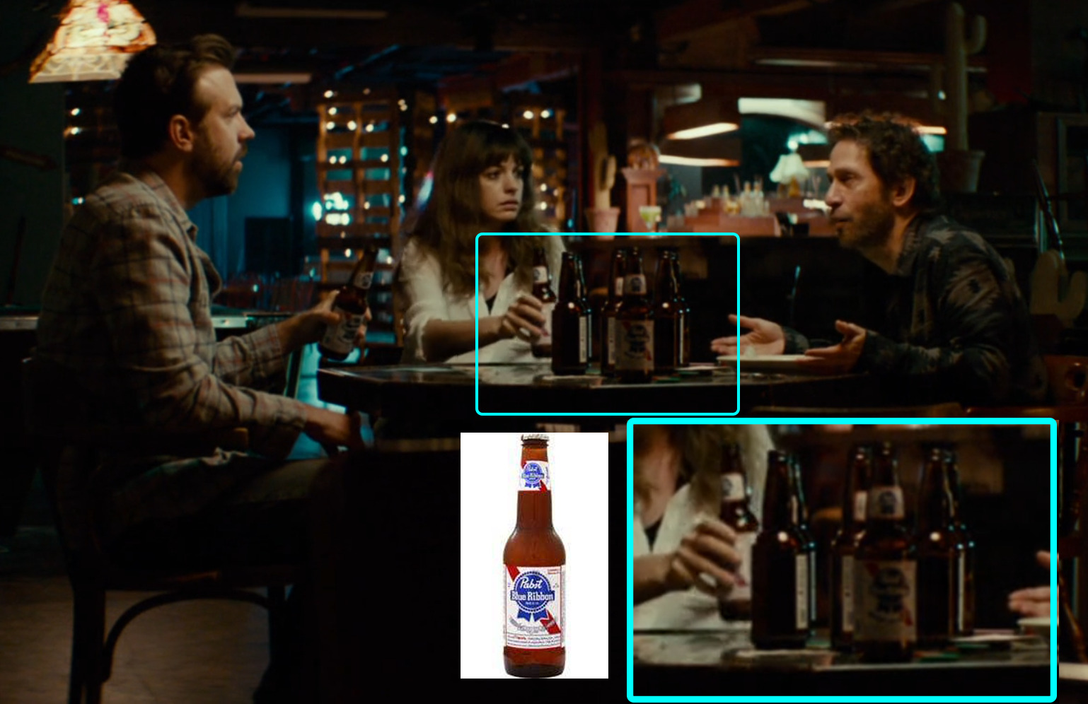 - Bottom Right: Jason Sudeikis, Anne Hathaway, and Tim Blake Nelson drink PBRs